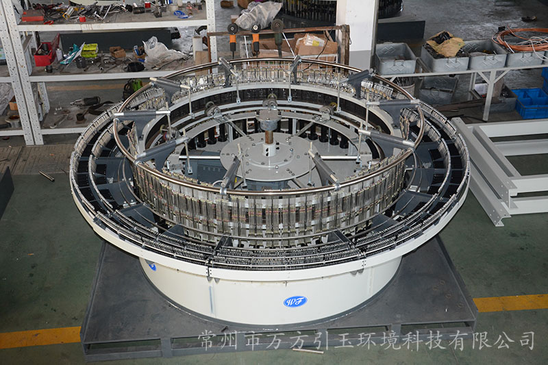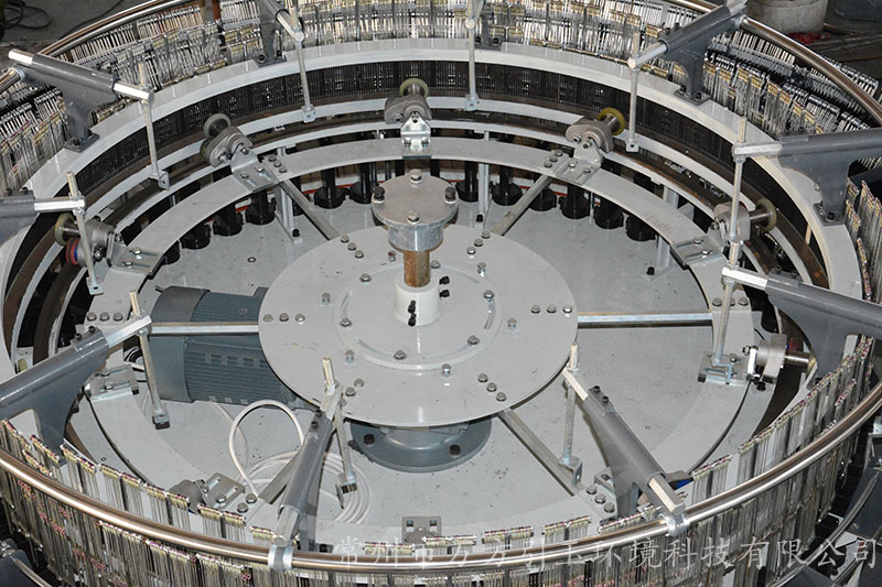 圓織機的經(jīng)紗架上有有許多紗錠,依據(jù)編織布幅寬和扁絲寬度,使用規(guī)定范圍數(shù)量的經(jīng)紗.經(jīng)紗進入圓織機前,由經(jīng)紗的棕框?qū)?jīng)紗進行交叉開口,緯紗梭子在交叉開口中作圓周運動穿過經(jīng)紗,編織成筒布. 一臺圓織機有幾把梭子,就有幾條緯紗同時織入.對于平織布,可用平織機,片梭織機,噴水織機編織.